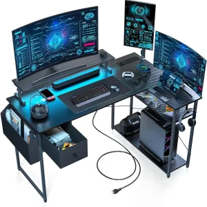 Gaming Desk, 47 inch L Shaped Gaming Desk, Computer Desk with LED Lights & Adjustable Stand, Power Outlets, Storage Drawer