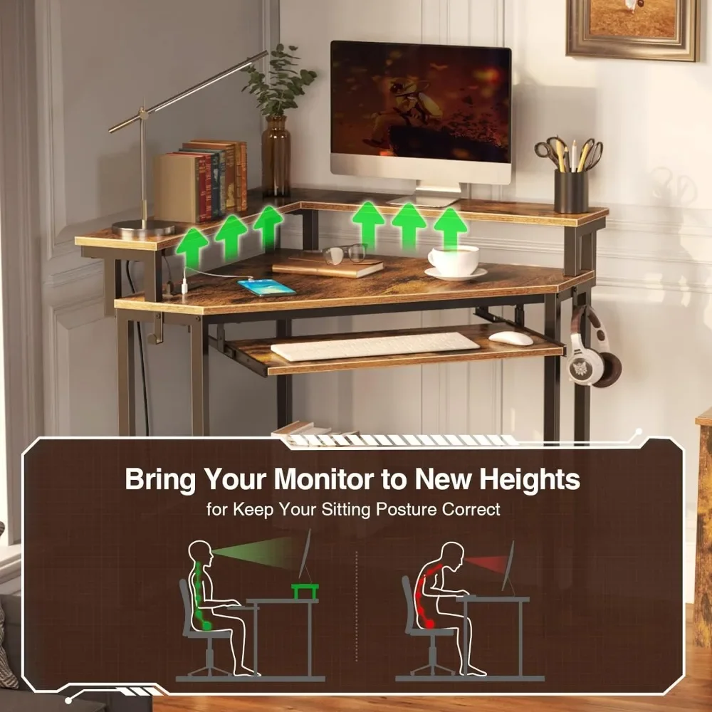 - [Full-Size Monitor Stand & Bottom Storage] Our uniquely designed full-size monitor stand and keyboard tray, which can hold two monitors, ensures that your line of sight and your monitor are always parallel when you sit at this computer desk, protecting your spine’s health. Additional storage shelves at the bottom for books, small printer and other daily use things, increasing storage space