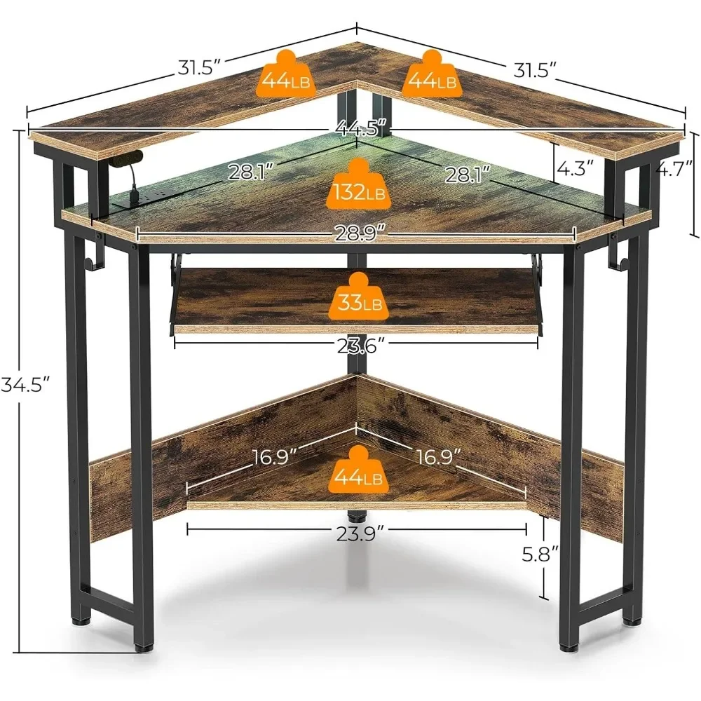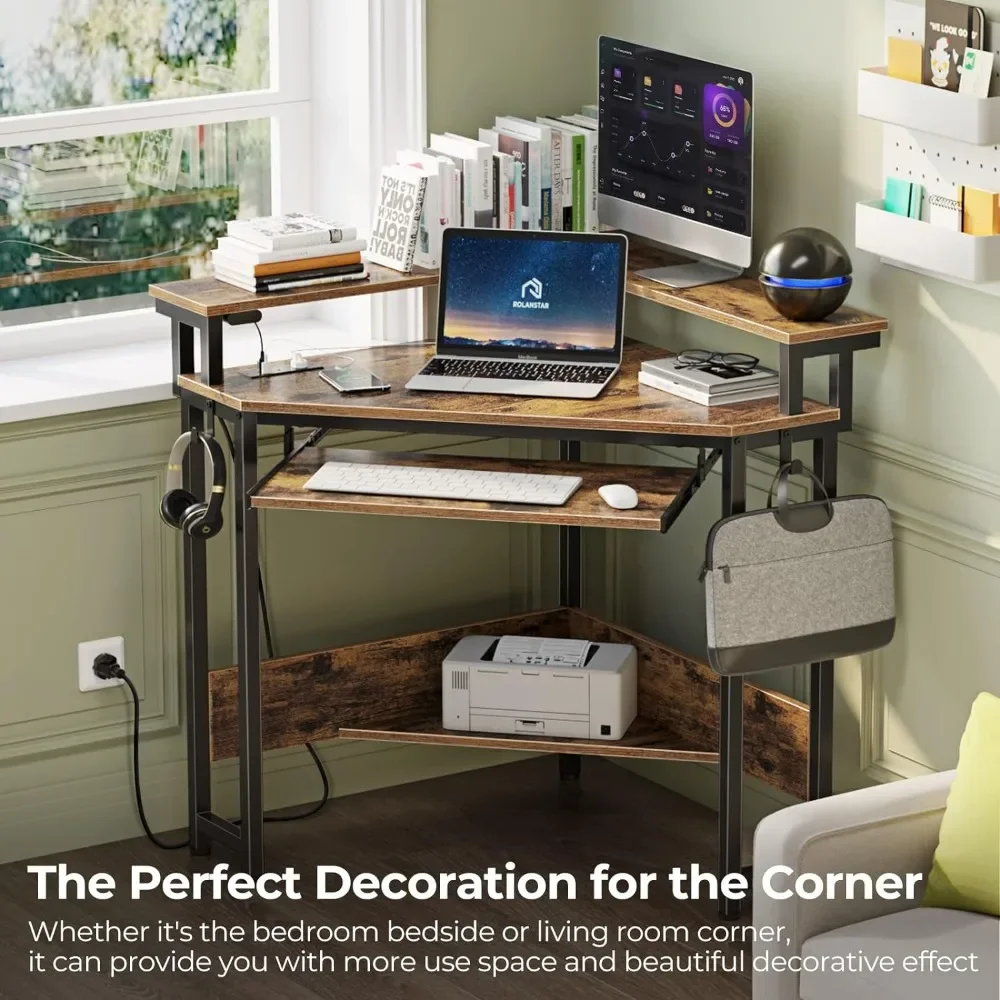 - [Corner Desk For Small Space] The Triangle corner desk is perfect for small corners of different rooms, such as living rooms, bedrooms, and studies. With added features such as a keyboard tray, full-size monitor stand and power strip compared to other writing desks, our corner table will create a practical space for you. In addition, it can also be used as a dresser in your bedroom, depending on your preference.
