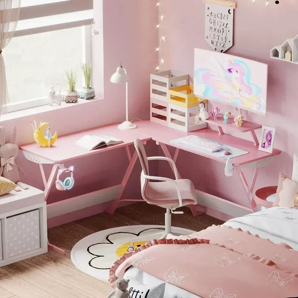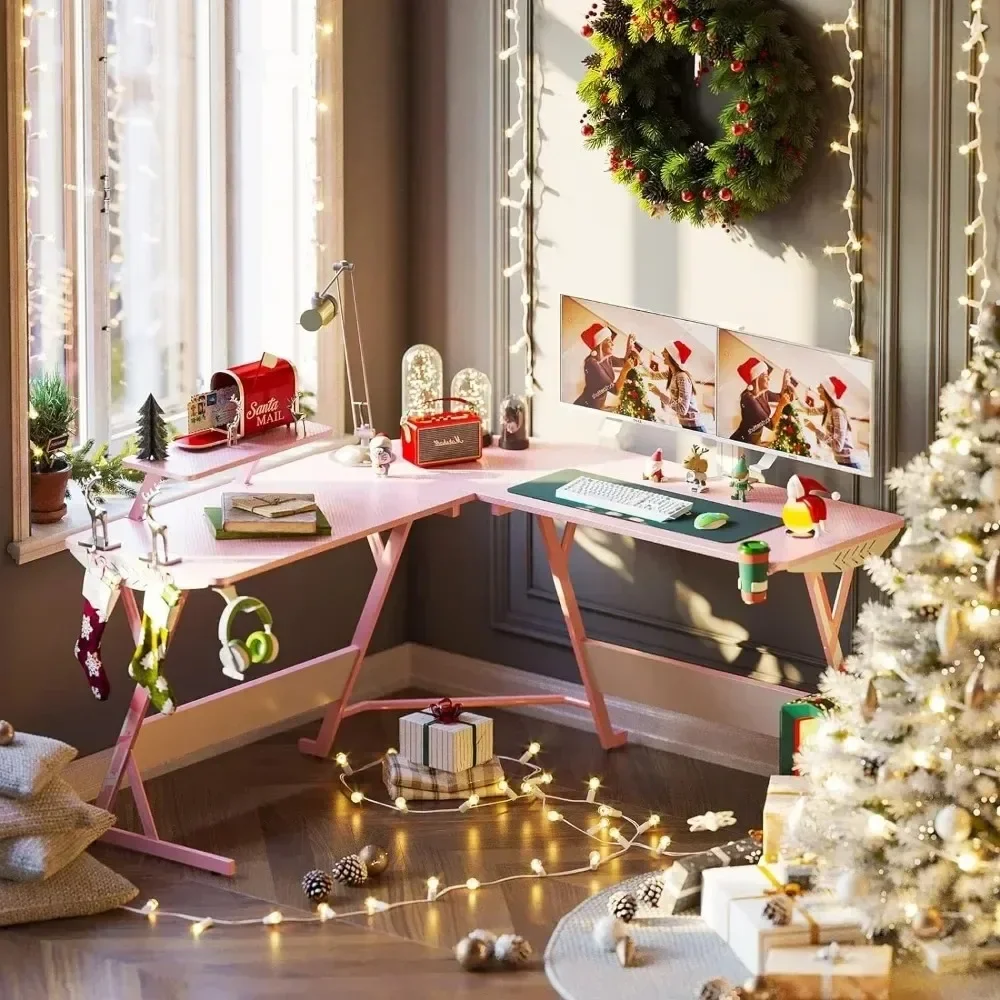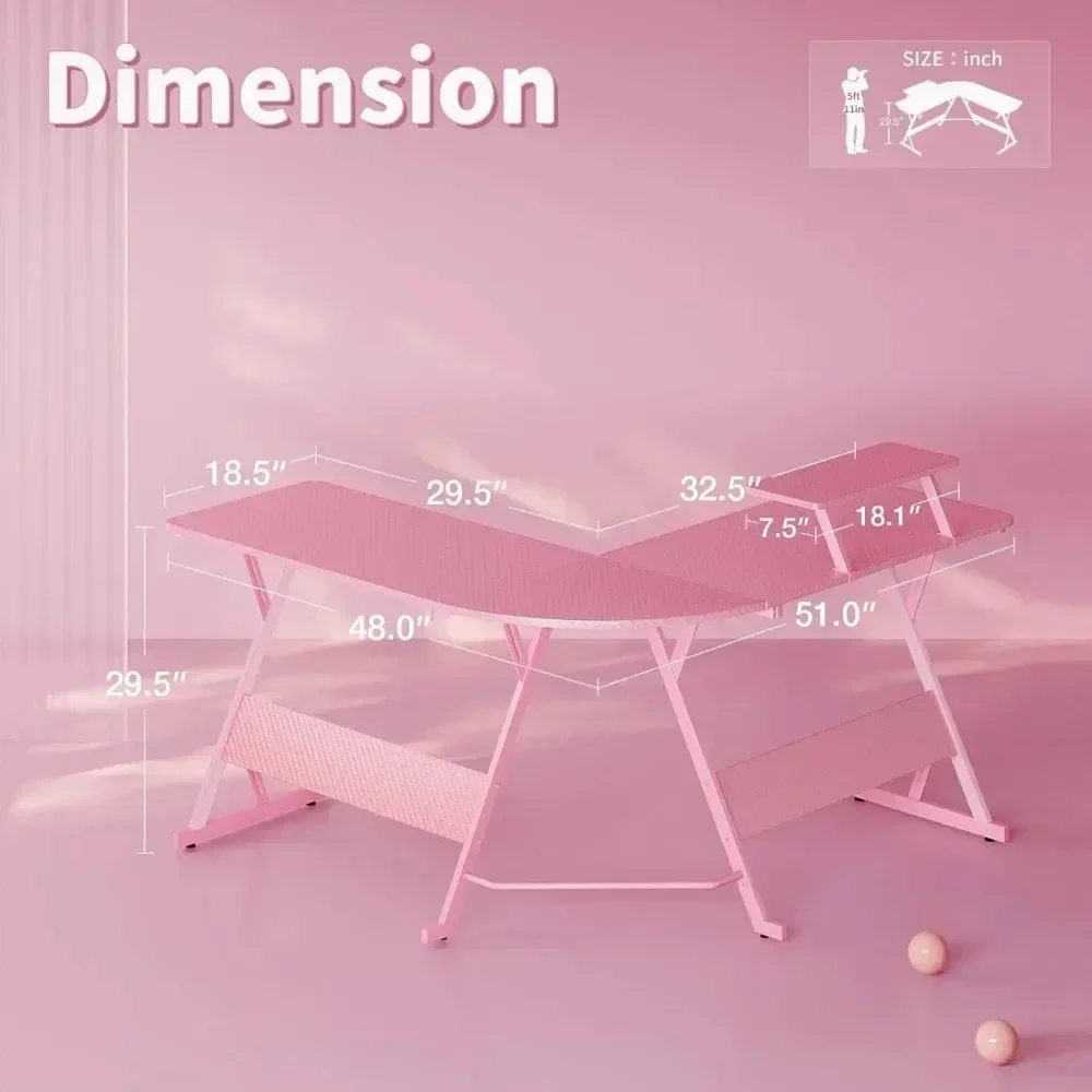 Pink L Shaped Gaming Desk, 51 Inch Gamer Desk Gaming Table with Carbon Fiber Texture, Corner Computer Desk L Shape